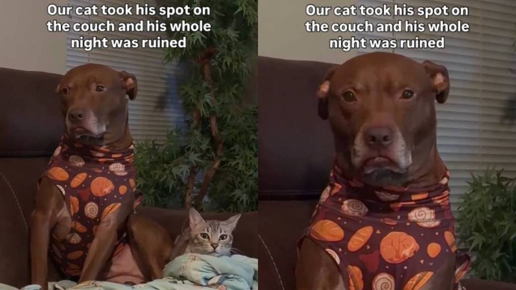 An adorable dog video on Instagram displayed a cute Pit Bull named Opie reacting to his cat sibling taking his spot on the couch during nighttime. The clip has captured the hearts of many on the internet as people loved the pup’s expressions.
