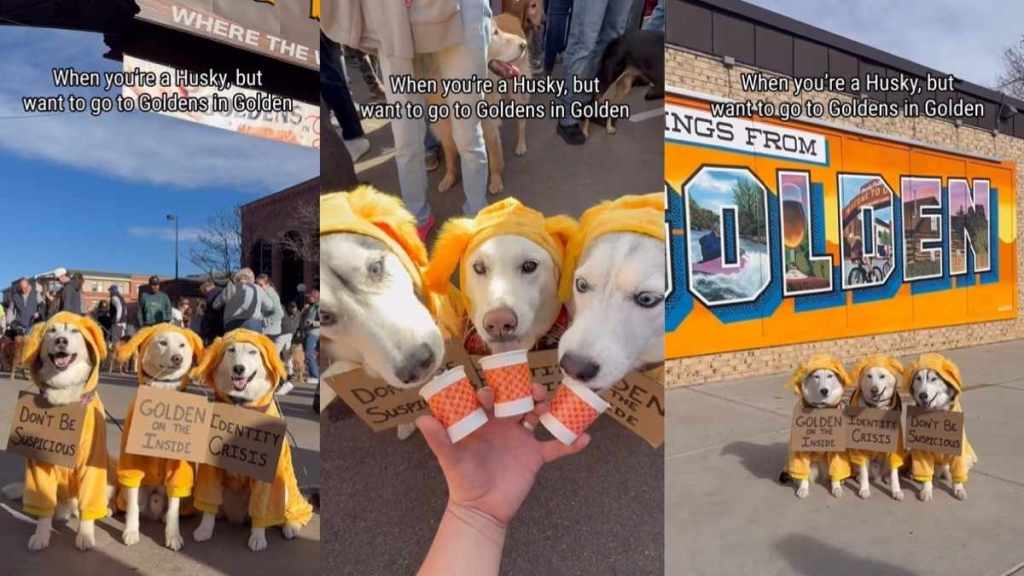“Fake it till you make it” seems to be the mantra for these Huskies, who really wanted to go to an event for Golden Retrievers. Living in Denver for years means Kira, Hoya, and Zoya have seen many mountain adventures. But missing the massive “Goldens in Golden” event for four years gave them serious FOMO. Every year, over 5,000 dogs take over the streets of Golden, Colorado. This year, the crew at @2husketeers decided to join the party. This video shows the trio attempting a very fluffy plan. They weren’t going to let a little technicality (being a Husky) stop them from getting pup cups.
