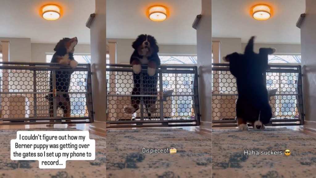 If you’re a new puppy parent, you know that finding a way to contain a growing dog is a bit of a struggle. Howie, a Bernese Mountain Dog from Minneapolis, was born just this past November. But he is already showing off his many talents over at @howietheberner. His owners actually had to set up a camera because they couldn’t figure out how he was escaping. And it turns out he’s a bit of a climber.