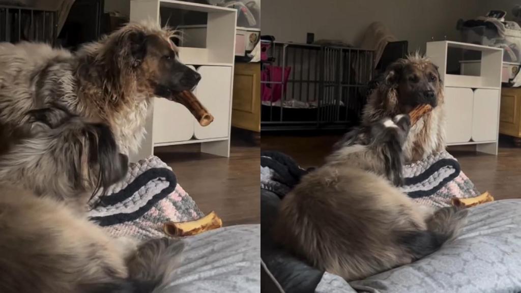 He tries to tease her one more time by moving his head away. But then he just gives in completely. He drops the whole bone right on her bed. Now they can both lick it at the same time. People in the comments are calling them the “Chewbacca siblings” because of all that fur. It’s a very gentlemanly move for a dog to make in this viral video.