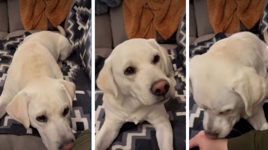 The video captures a familiar domestic scene. Dad settles down, likely hoping for a quiet moment. But Hank has other plans. Almost immediately, the Labrador begins engaging with his owner’s hand, nudging and pawing at it as if issuing a playful challenge. Instead of calmly lying nearby, Hank treats Dad’s relaxed hand like a worthy opponent. The caption reads: “Seems like a pretty good time to pick a fight with dad’s hand.” And that is exactly what he does.