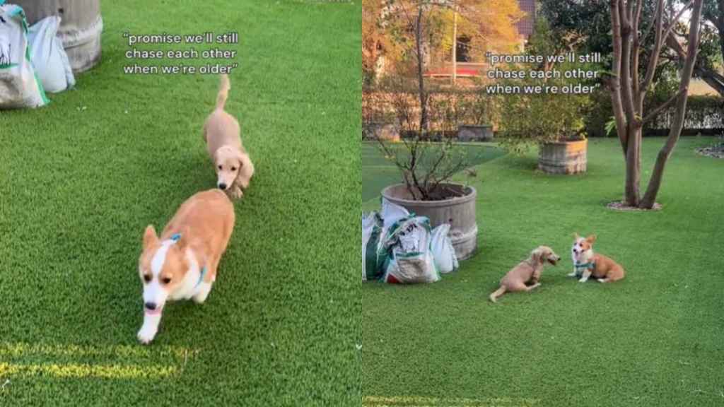 When the clip opens, we see Enoki tearing up a lush lawn in Bangkok with his favorite Corgi puppy in tow. This video from @en__oki shows the two dogs acting like total besties while they sprint around a massive potted tree.